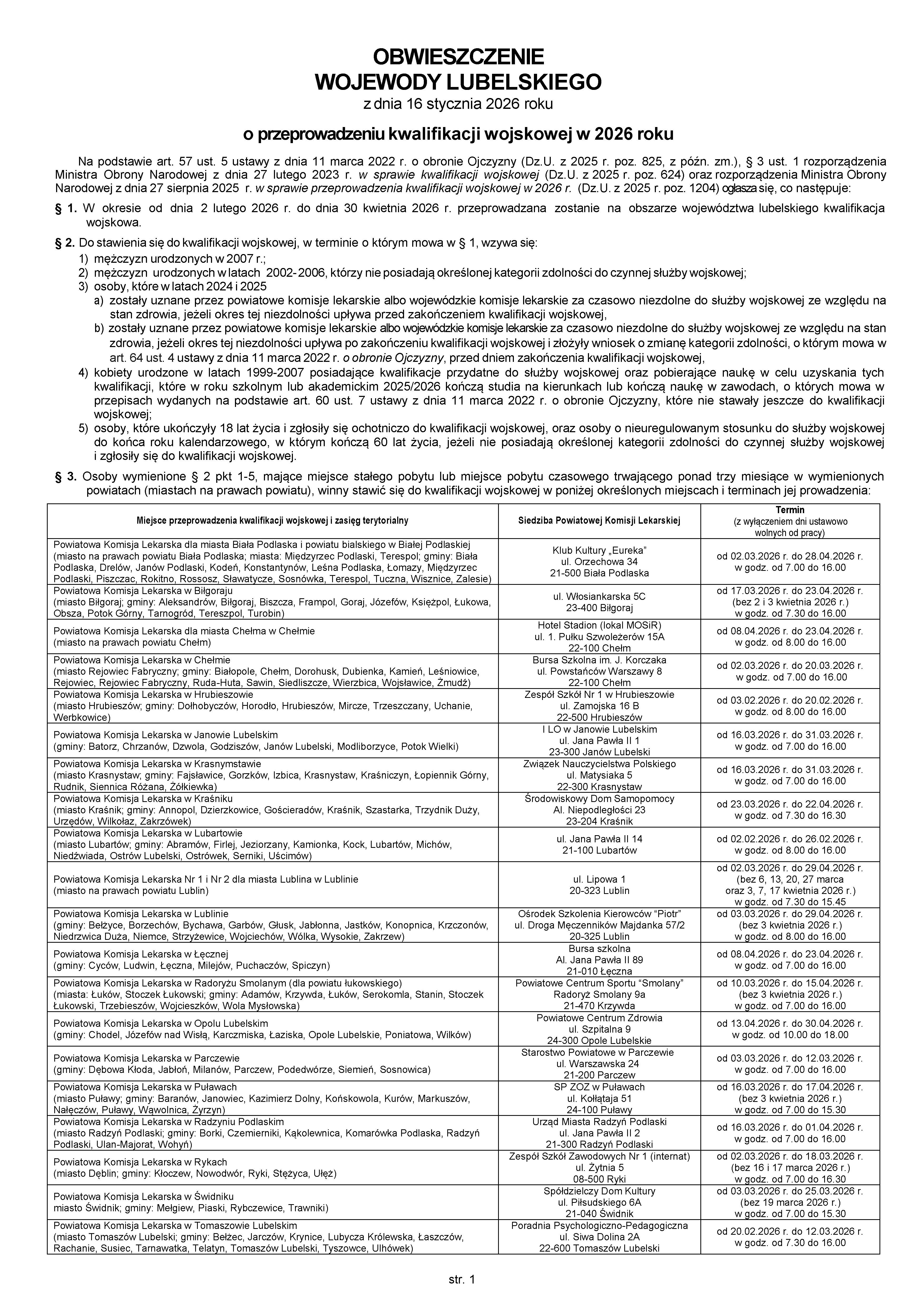 OBWIESZCZENIE WOJEWODY LUBELSKIEGO z dnia 16 stycznia 2026 roku o przeprowadzeniu kwalifikacji wojskowej w 2026 roku